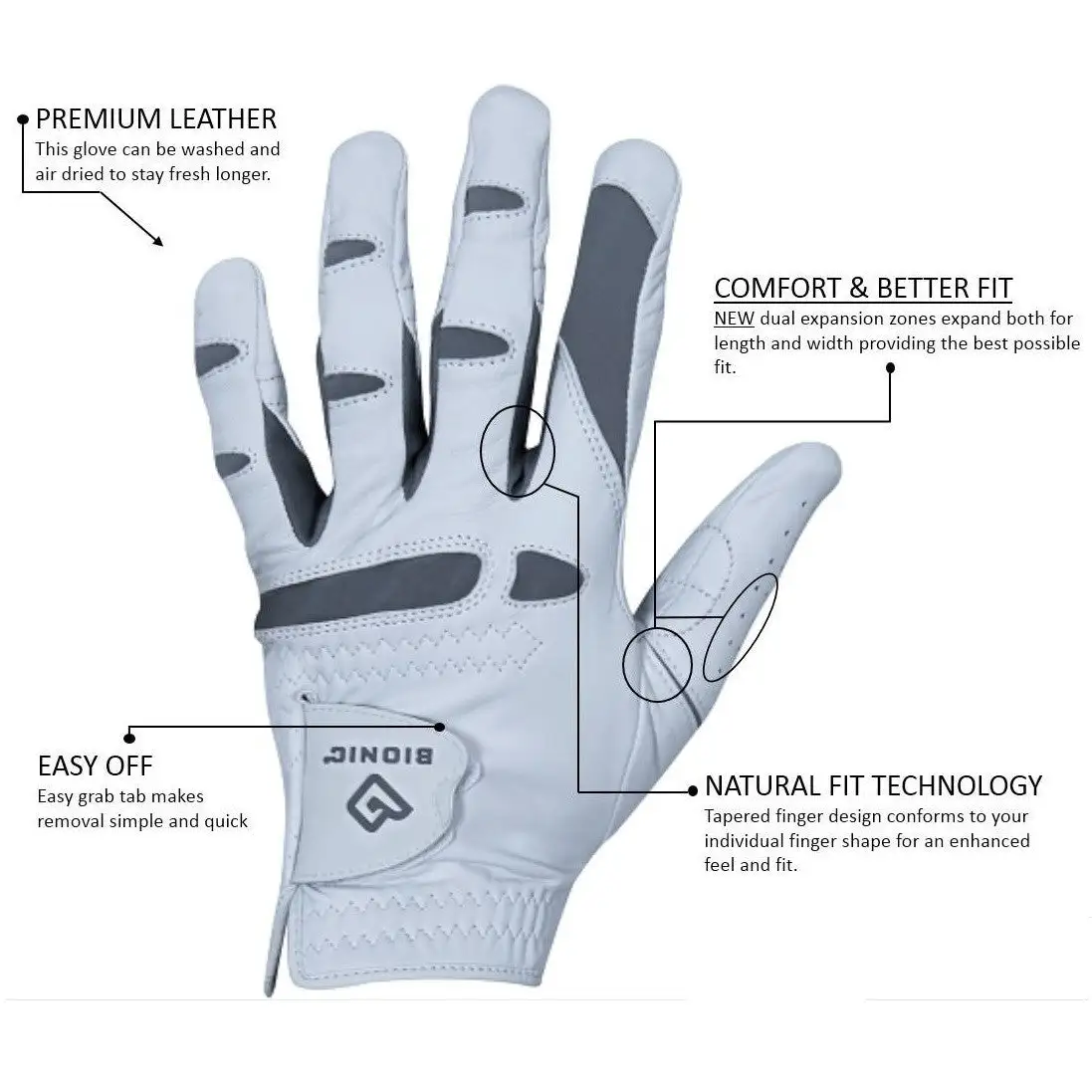 The new Bionic PerformanceGrip ® Pro Golf Gloves were designed for the competitive golfer by a hand specialist with patented natural fit technology to provide superior feel with the golf club. The gloves are crafted from premium Cabretta leather. Terrycloth pads inside the glove are strategically-placed to promote a light grip and absorb perspiration to keep hands cool and dry. Dual expansion zones for length and width on the thumb allow for better comfort and fit.
