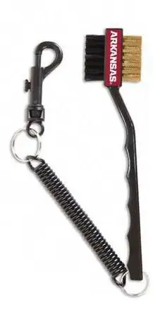 This golf brush brings some fan fun to an essential item for your golf bag! It has nylon bristles for delicate club cleaning, and brass bristles for the tough jobs like the bottom of your shoes. It has a clip and elastic cord for easy attachment and is decorated with a Mylar logo.