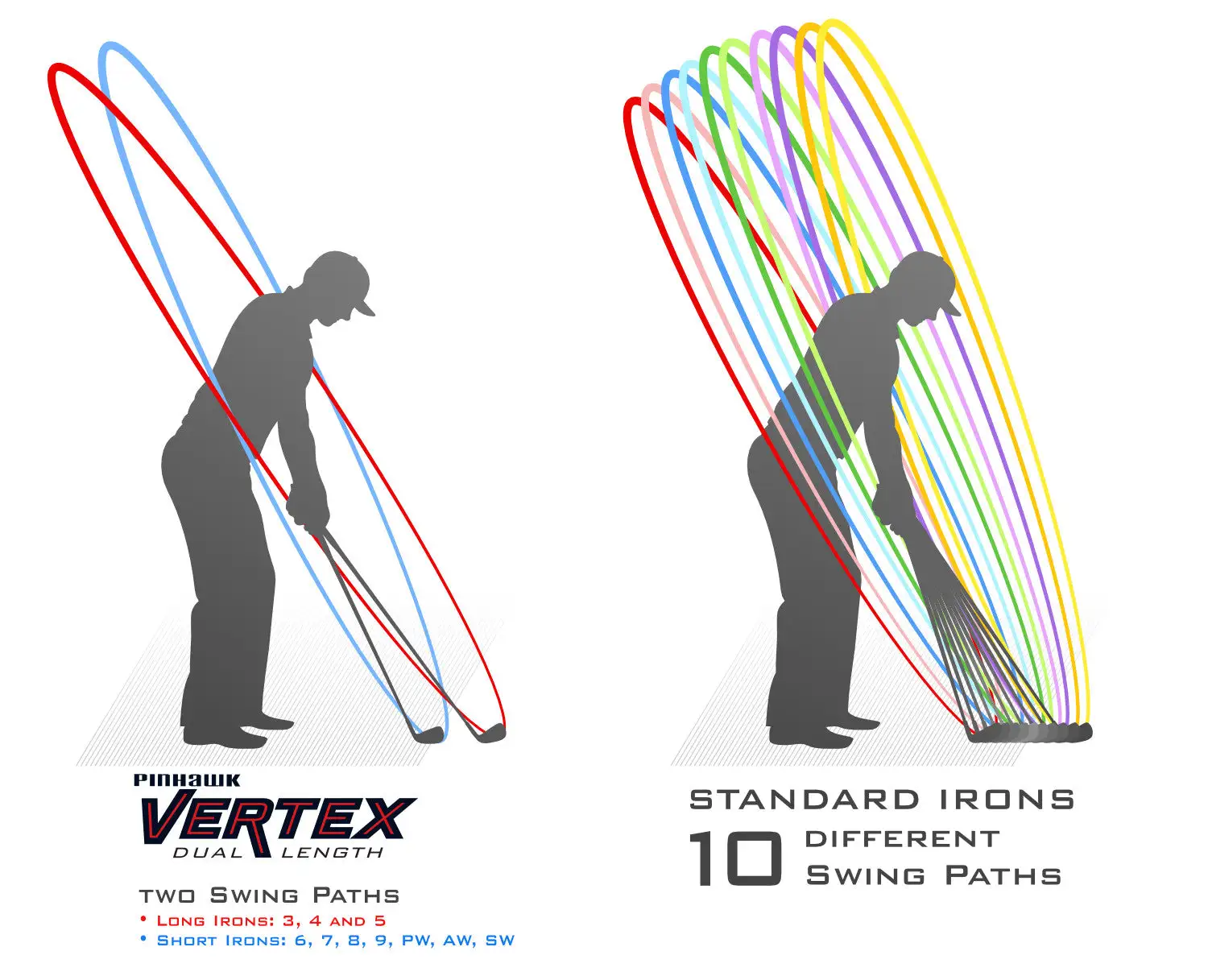This configuration results in no distance loss in the long irons and the full benefits of single length irons in the “short” set (6-SW). 2 different lengths, and just 2 swing planes, vs many planes in a traditional set. |