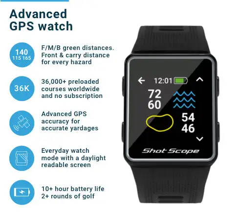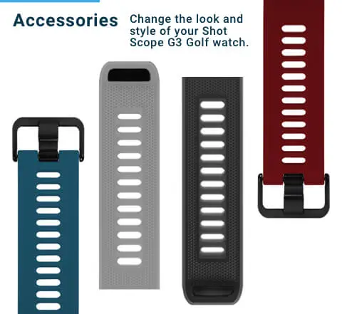 Shot Scope G3 is a highly accurate GPS watch with distances to greens available in yards or meters. G3 provides GPS distances to the front and back of hazards, allowing a strategy to be formed for the hole. Shot Scope G3 comes preloaded with over 36,000 courses worldwide and free firmware updates. A daylight readable color screen and easy to navigate buttons, make G3 easy to use while golfing. Shot Scope G3 is one of the lightest GPS watches on the market.